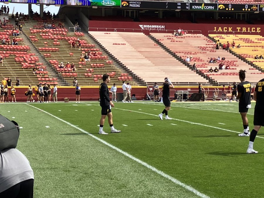 Iowa QB Cade McNamara with a compression sleeve on his right upper leg as he participates in warmups.